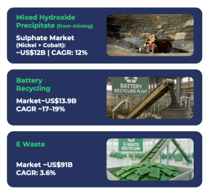 📌 Target Market: Global battery recycling (US$13.9B, growing at 17–19% CAGR)